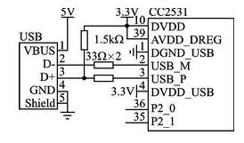 CC2531的USB硬件連接很簡(jiǎn)單,如圖3所示。采用USB總線(xiàn)供電方式,通過(guò)電壓轉(zhuǎn)換芯片AM11173.3為硬件電路提供3.3 V電壓(圖中未畫(huà)出)。由于該設(shè)備為全速設(shè)備,因此D+信號(hào)線(xiàn)通過(guò)電阻上拉。