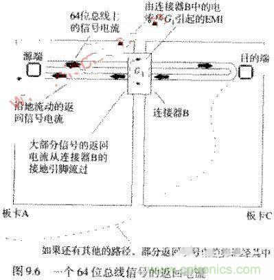 圖9.6舉例說明了一個(gè)普通的電磁干擾問題。一個(gè)64位總線從板卡A經(jīng)過連接器B連到母板卡上,母板卡可能是一個(gè)主CPU卡或是一個(gè)通往其他子卡的無源通道。64條信號(hào)線的返回電流從母板卡C流回板卡A,其中的絕大部分通過了連接器B的接地腳。