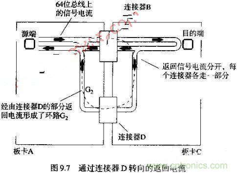例如,在圖9.7中,假設(shè)板卡A和C共用兩個(gè)連接器,另外增加的連接器記為D,將其安排在與連接器B相隔一段距離的地方?,F(xiàn)在有一部分信號(hào)的返回電流可以由連接器D上的地線流加A,如圖9.7中的環(huán)路G2所示。