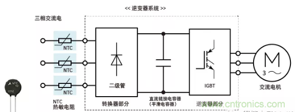 逆變器系統(tǒng)主要由轉(zhuǎn)換器級、逆變器級和直流側(cè)電容(平滑電容)組成,該電容放置在轉(zhuǎn)換器級之后,如下所示。上電時,器件會通過沖擊電流進(jìn)行充電,而該沖擊電流的峰值是(為直流側(cè)電容充電的)穩(wěn)定電流的若干倍。該沖擊電流可能會對直流電容的使用壽命產(chǎn)生不利影響,或損壞半導(dǎo)體器件。為了防止沖擊電流,我們需要連接NTC熱敏電阻。