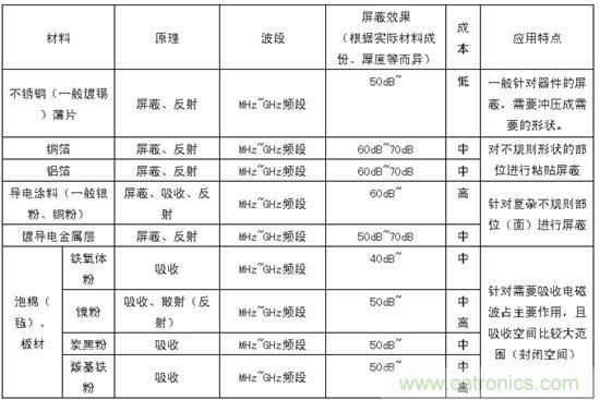 不銹鋼、銅箔、鋁箔、導(dǎo)電涂料、電磁波吸收材料(鐵氧體、鎳粉、碳黑、羰基鐵等)。