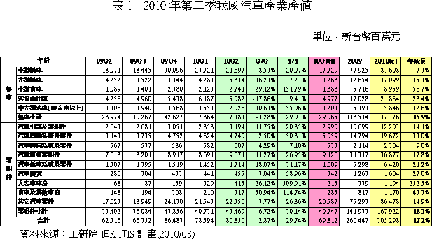 2010年第二季汽車產(chǎn)業(yè)總產(chǎn)值預(yù)估為新臺(tái)幣808.5億元,較上一季成長2.87%,較2009年同期成長29.74%(表1)。