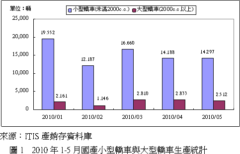 觀察1-5月國產(chǎn)小型轎車與大型轎車生產(chǎn)情形(圖1),小型轎車1月份的產(chǎn)量遠(yuǎn)高于其他月份,乃部分產(chǎn)量對(duì)應(yīng)2009年貨物稅減徵期間尚未消化的訂單,另外2月份較少的生產(chǎn)日數(shù)造成整車產(chǎn)量為各月中最低者,特別是大型轎車的部分。 相較于2010年第一季,預(yù)估第二季整車總產(chǎn)值衰退1.28%,小型轎車產(chǎn)值衰退8.5%,而大型轎車產(chǎn)值則有36.2%的成長。