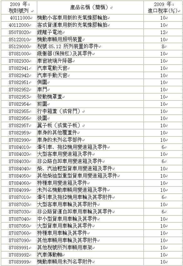 - 兩岸經(jīng)濟(jì)合作架構(gòu)協(xié)議於6月29日第五次「江陳會(huì)」正式簽署完成,汽車零組件納入早期收獲清單,主要為輪胎、車身零件、傳動(dòng)件,另包括鋰離子電池等。
