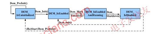 DCM模組遵循的標(biāo)準(zhǔn)與DCM相同,負(fù)責(zé)直接處理與DTC相關(guān)的服務(wù),如UDS中的0x19服務(wù)(響應(yīng)報文由DCM發(fā)送出去)。當(dāng)軟體構(gòu)件中的MonitorFunction檢測到故障或BSW模組檢測到故障時,將通知DEM模組處理和儲存‘診斷事件’(由EventID進行標(biāo)識)。如果故障確診,唿叫NVRAMManager(非揮發(fā)性記憶體管理器)提供的介面將其存取到非揮發(fā)性記憶體中,同時通知應(yīng)用層進行故障指示。DEM的狀態(tài)圖如圖3所示: