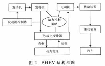 混合動(dòng)力電動(dòng)汽車(chē)由發(fā)動(dòng)機(jī)和蓄電池共同提供動(dòng)力,發(fā)動(dòng)機(jī)和電動(dòng)機(jī)可進(jìn)行不同組合得到不同的驅(qū)動(dòng)方案,如:串聯(lián)、并聯(lián)及混聯(lián)。整車(chē)性能的好壞不僅與發(fā)動(dòng)機(jī)和電動(dòng)機(jī)等部件有關(guān),還與其控制策略和優(yōu)化方法有關(guān)。按照能源組合的方式,混合動(dòng)力電動(dòng)汽車(chē)可按動(dòng)力驅(qū)動(dòng)方式分為串聯(lián)式混合動(dòng)力電動(dòng)汽車(chē)(SHEV)和并聯(lián)式混合動(dòng)力電動(dòng)汽車(chē)(PHEV)。
