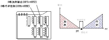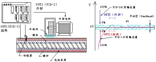 DTE10T在擴(kuò)展輸出模塊后,SUB1輸出口可定義為冷卻輸出控制。利用雙PID計(jì)算,在溫度沒有沖過設(shè)定值時(shí),溫控器就可提前啟動(dòng)冷卻風(fēng)機(jī),避免了溫度從高不下的情,并能保持溫度穩(wěn)定性。個(gè)人認(rèn)為報(bào)警驅(qū)動(dòng)的冷卻模式總將由于控溫不穩(wěn)定等原因被淘汰。雙PID控制方式必定是追求更高控溫精度的首選。如圖5所示。