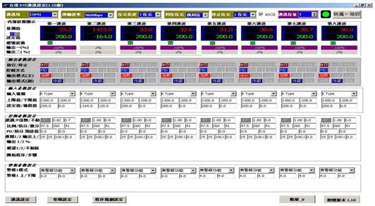 DTE對于參數(shù)的設(shè)置完全可以采用DTE專用的PC軟件來完成,全中文的DTE設(shè)置畫面簡單明了。不動(dòng)區(qū)等參數(shù)需要結(jié)合現(xiàn)場實(shí)際工況來分析與設(shè)定。塑料擠出機(jī)一般可設(shè)置在:0.~2之間,而PID參數(shù)可以借助AT自動(dòng)完成。
