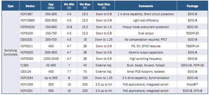 安森美半導(dǎo)體的開關(guān)控制器的關(guān)鍵特性包括寬輸入電壓范圍、緩沖的外部高于1.25 V的電壓參考、電源良好+啟用/禁用引腳、外部同步和輸出過壓和欠壓保護(hù)。根據(jù)型號不同,具有支持短路保護(hù)、高輕載能效、斷續(xù)(hiccup)模式過流保護(hù)、雙輸出、無需補償、PG/EN/SYNC功能、使用陶瓷輸出電容、高開關(guān)頻率、降壓/升壓/正前/反激、支持小PCB面積、支持隔離、PoE應(yīng)用、集成開關(guān)等特性,詳見下表。