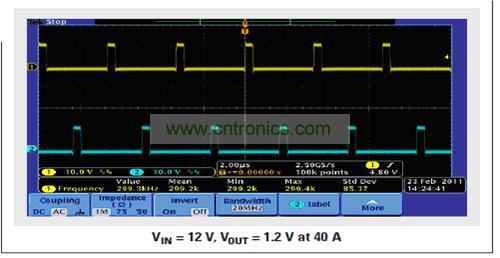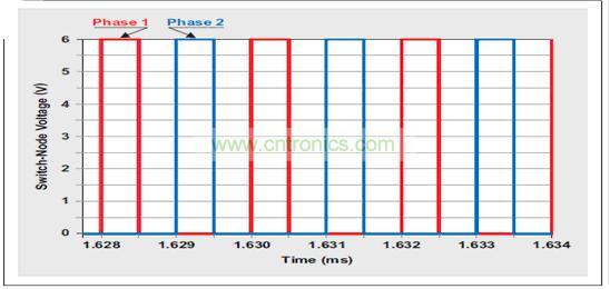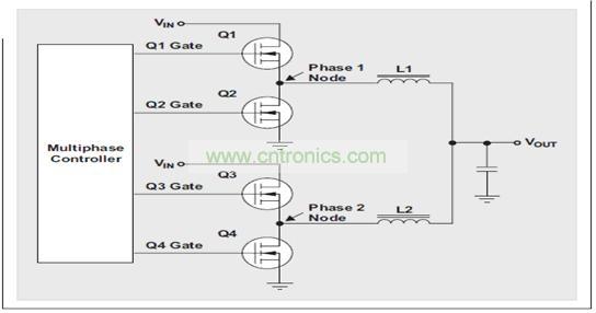 圖1 顯示了一款二相電路。由該電路的波形(圖2 所示)可以清楚地看到各相互相交錯。這種交錯可減少輸入和輸出紋波電流。另外,它還減少了印刷電路板或者某個特定組件上的熱點。實際上,二相降壓轉(zhuǎn)換器讓FET 和電感的RMS-電流功耗降低了一半。相交錯還可以降低傳導損耗。