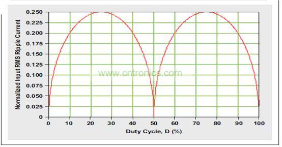 圖5 標準化輸入RMS紋波電流為占空比的函數(shù)