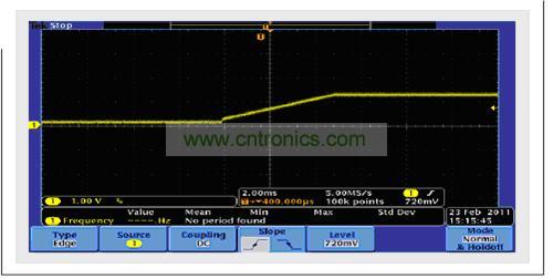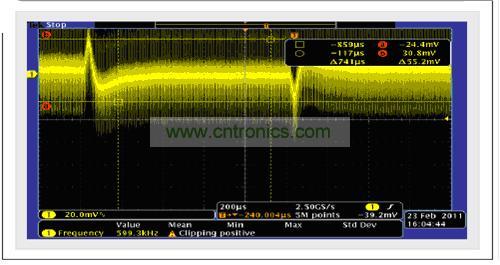 圖10 瞬態(tài)響應:10-A負載步長20 µs(過沖/下沖約27 mV)