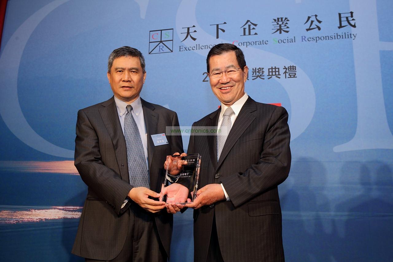 臺達(dá)電子海英俊董事長(左)出席2012 天下雜誌企業(yè)公民獎頒獎典禮, 自 蕭萬長前副總統(tǒng)手中接過大型企業(yè) 首獎