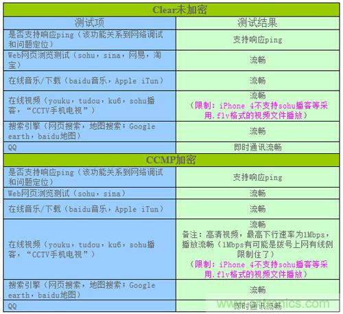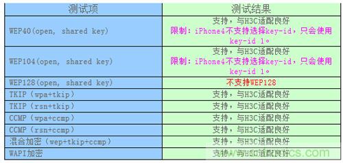 從測試結果可以看出:除了WEP128,iPhone 4對各種加密方式均能很好的支持,在采用混合加密的H3C WLAN網(wǎng)絡中也能很好的相互適配。