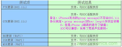 從測試結果可以看出,iPhone 4的GTK更新報文并不符合802.11i協(xié)議的規(guī)定,對group message2的key length域錯誤的進行了賦值。H3C設備由于對此采用了寬進嚴出的原則,可以很好的進行兼容。這一點也體現(xiàn)出手機終端兼容性測試的重要性。