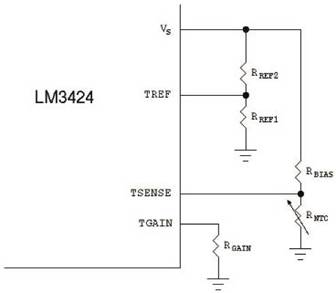 為了實現(xiàn)根據(jù)溫度調(diào)節(jié)LED電流的目標(biāo),可以使用多種不同的方法。一種方法是構(gòu)建溫度感應(yīng)電路,用于驅(qū)動LED驅(qū)動器集成電路的模擬電流調(diào)節(jié)針腳。更簡單的解決方法是使用LM3424等具有內(nèi)置熱返送功能的LED驅(qū)動器集成電路。圖2顯示了LM3424熱返送功能所需的外部零部件示例。