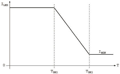 LED制造商通常在數(shù)據(jù)表中包含顯示LED最大允許正向電流和溫度的圖線,以確保部件的可靠性,這也稱為安全工作區(qū)。LED的最大電流額定值在較低溫度測得,但在超出特定溫度后,最大允許電流值降低。由于LED系統(tǒng)的首要設(shè)計要素是適當(dāng)?shù)纳岷屯L(fēng),因此很多應(yīng)用需要考慮不可預(yù)測的狀況,即使最佳的熱設(shè)計也可能無法預(yù)防這些狀況。例如大燈組件被污泥或其他碎屑堵塞的情況。由于對車輛的安全操作至關(guān)重要,因此在此類情況下,需要保持LED在較低操作點正常照明,同時使電流保持在安全工作區(qū),以預(yù)防照明系統(tǒng)的災(zāi)難性故障。