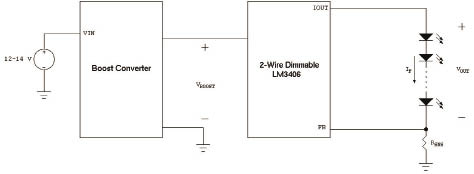 根據(jù)具體的設(shè)計,上述問題的影響可能可以忽略。但是,如果系統(tǒng)設(shè)計師對上述影響存有顧慮,可以采用單個串聯(lián)燈組作為首選拓?fù)浣Y(jié)構(gòu)。在這種解決方法中,仍可以使用LM3406等部件,但將增大系統(tǒng)復(fù)雜性,因為需要新前端部件用于傳輸超出12V~14V的電源電壓為LED驅(qū)動器供電。然后,LED驅(qū)動器降低此新電壓,為單個LED燈組供電。這可以通過在直流電源和LM3406之間增加升壓DC/DC功率級輕松實現(xiàn),如圖10所示。通過此拓?fù)浣Y(jié)構(gòu),串聯(lián)燈組中的所有LED均具有相同的電流,無論各LED的VF值是多少。