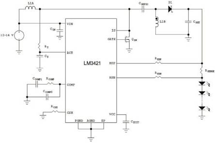 LM342x系列使用控制器集成電路實現(xiàn)所需功能和總體系統(tǒng)設(shè)計的最大靈活性。圖1以LM3421為例,顯示升壓配置中使用LM342x系列驅(qū)動LED燈組的一個示例。LM342x拓?fù)浣Y(jié)構(gòu)的一個主要特點是在LED高側(cè)進行電流感應(yīng),允許燈組中的最后LED的陰極局部在底盤接地,并使感應(yīng)電壓可以差分地饋送回集成電路。這是一個重要的優(yōu)點,因為使LED燈組和驅(qū)動器集成電路可以彼此分離。