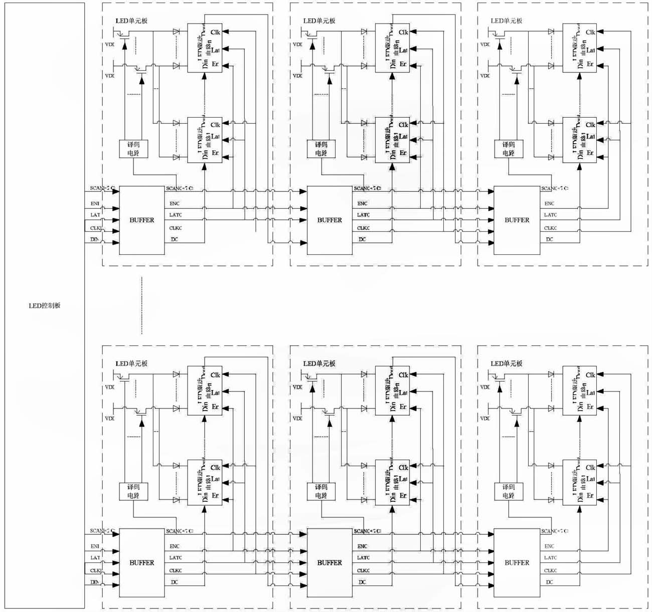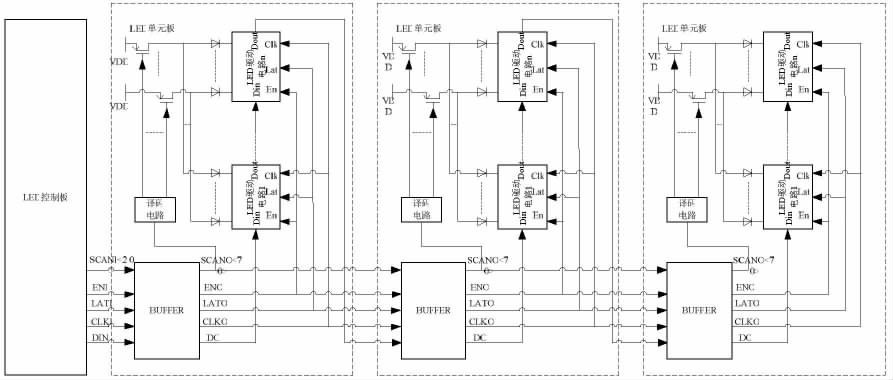 LED 控制板與LED 單元板構(gòu)成的LED 顯示系統(tǒng)的主體,如圖1 所示。其中,LED 單元板包括了增強(qiáng)信號(hào)驅(qū)動(dòng)能力的BUFFER 電路、產(chǎn)生動(dòng)態(tài)顯示掃描時(shí)序的譯碼電路、若干個(gè)開(kāi)關(guān)管和若干個(gè)LED 驅(qū)動(dòng)電路。其通信過(guò)程為:LED 控制板發(fā)出的通信信號(hào)依次經(jīng)過(guò)各串接的LED 單元板的BUFFER 電路進(jìn)行驅(qū)動(dòng)增強(qiáng);各LED 單元板中經(jīng)BUFFER 電路增強(qiáng)后的掃描信號(hào)(SCANO)提供給本LED 單元板的譯碼電路,譯碼電路譯碼產(chǎn)生動(dòng)態(tài)顯示掃描時(shí)序控制開(kāi)關(guān)管;各LED 單元板中經(jīng)BUFFER 電路增強(qiáng)后的使能信號(hào)(ENO)、鎖存信號(hào)(LATO)、時(shí)鐘信號(hào)(CLKO)分別提供給本LED 單元板中所有LED 驅(qū)動(dòng)電路。