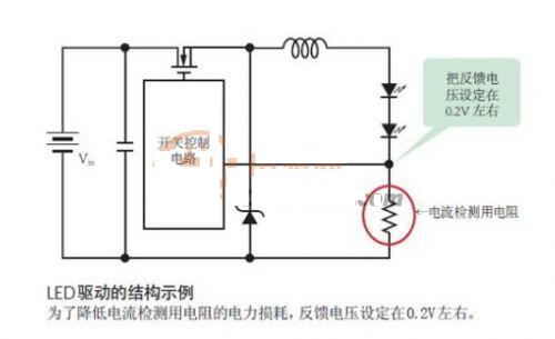 通常,開關(guān)穩(wěn)壓器IC設(shè)定的反饋電壓約為1.2V。但對(duì)于LED驅(qū)動(dòng)IC,1.2V過大。因?yàn)榘演敵鲭娏鬓D(zhuǎn)換成電壓的數(shù)百mΩ 的電阻(電流檢測(cè)用電阻)需要與LED串聯(lián)。對(duì)于照明器具等使用的高亮度LED,流經(jīng)的是1.5A和2A等大電流。如果500mΩ的電流檢測(cè)用電阻中通過1.5A的電流,僅此一項(xiàng)就會(huì)產(chǎn)生0.75W的電力損耗。因此,LED驅(qū)動(dòng)IC把反饋電壓設(shè)定在了非常低的0.2V左右。這樣一來,不僅可以使用較小的電流檢測(cè)用電阻,而且在大電流通過時(shí),也可以把電力損耗控制在較低的水平。