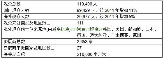 第十七屆「廣州國(guó)際照明展覽會(huì)」展覽面積達(dá)21萬(wàn)平方米,規(guī)模較2011年增長(zhǎng)5%,參展企業(yè)2653家,比上屆減少9%,參展企業(yè)來(lái)自全球27個(gè)國(guó)家和地區(qū)。本屆展會(huì)觀(guān)眾數(shù)目同創(chuàng)新高,吸引了110,406名觀(guān)眾,較2011年增長(zhǎng)10%,分別來(lái)自111個(gè)國(guó)家及地區(qū),其中國(guó)內(nèi)專(zhuān)業(yè)觀(guān)眾89,429人,較2011年增加11%,海外專(zhuān)業(yè)觀(guān)眾20,977人,較2011年增加5%,海外觀(guān)眾前十位來(lái)源地分別是港澳臺(tái)地區(qū)、印度、韓國(guó)、美國(guó)、新加坡、日本、泰國(guó)、澳大利亞、馬來(lái)西亞和德國(guó)。大會(huì)同期舉辦的各類(lèi)技術(shù)研討會(huì)、產(chǎn)業(yè)高峰論壇、產(chǎn)品推介會(huì)、交易節(jié)等高水平會(huì)議、論壇交流活動(dòng)多達(dá)110多場(chǎng)次,較去年增加10場(chǎng),亦創(chuàng)新高。