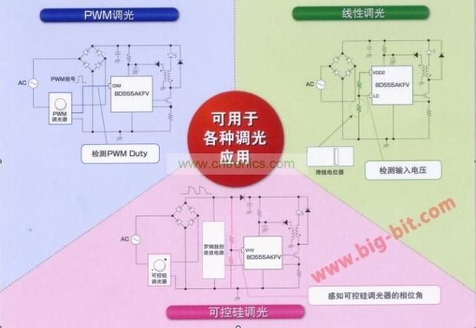 其主要特點(diǎn)是:可進(jìn)行可控硅/PWM/線性調(diào)光。適用于各種調(diào)光應(yīng)用(調(diào)光比0.2%-100%);內(nèi)置緩沖功能,照度變化平穩(wěn)(可選擇有緩沖、無緩沖);通過LED平均電流控制,可針對輸入電壓、輸入電壓變化,控制相應(yīng)的LED電流。這種對應(yīng)可控硅調(diào)光的LED照明用驅(qū)動IC可用于兼容調(diào)光器的燈泡型LED照明、兼容調(diào)光器的LED筒燈照明和兼容調(diào)光器的LED基礎(chǔ)照明。