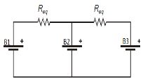 該電路可以等效成如圖3 所示電路,在每?jī)蓚€(gè)電池單體之間連接一個(gè)等效電阻,可以推出如等式淵1冤給出的等效阻值。這種方法由于能量逐個(gè)傳遞,因此均衡時(shí)間較長(zhǎng),可以根據(jù)等式淵1冤,通過(guò)改變開(kāi)關(guān)器件的開(kāi)關(guān)頻率和電容容值的方法調(diào)節(jié)等效電阻,改變充放電電流。
