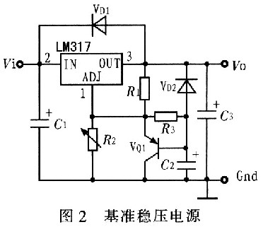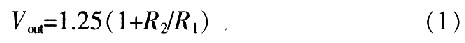 LM317是美國國家半導(dǎo)體公司的三端可調(diào)正穩(wěn)壓器集成電路,輸出電壓范圍是1.2~37 V,負(fù)載電流最大為1.5 A,使用簡單。其工作過程如下:輸出電壓Vout通過R1、VQ1,對C2充電,開始時VQ1飽和導(dǎo)通,Vout最低(約1.5 V)。隨著C2上電壓的升高,VQ1逐漸退出飽和并趨于截止,Vout逐漸升高至額定電壓。改變R1、C2的常數(shù)可改變軟啟動的時間。改變可變電阻R2的值,可調(diào)整輸出電壓Vout的值。VD1用于關(guān)機(jī)后使C2上的電荷快速泄放。其輸出電壓為: