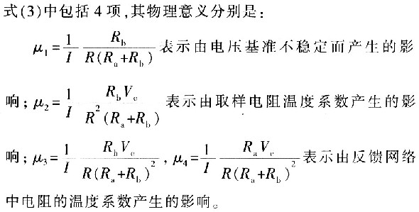 由于選取的取樣電阻R為歐姆級,而(Ra+Rb)為數(shù)十千歐姆級,因此有:μ2>μ1>μ3≈μ4,這說明影響輸出電流穩(wěn)定度的主要因素是取樣電阻的溫度系數(shù)和電壓基準(zhǔn)的穩(wěn)定度。在本恒流源中,選用取樣電阻精度是0.1%,溫度系數(shù)是±2.5×10-5/℃,電壓基準(zhǔn)的溫度系數(shù)小于1×10-6/℃。