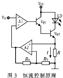 為了實現(xiàn)高的電流穩(wěn)定度,驅(qū)動電路大多采用負(fù)反饋的控制方法,恒流控制原理如圖3所示。穩(wěn)流電路由基準(zhǔn)電壓電路、電壓-電流轉(zhuǎn)換電路、恒流輸出電路和反饋電路組成。電路工作時,基準(zhǔn)電壓經(jīng)過適當(dāng)放大后送入運(yùn)放A1的同相端,運(yùn)放A1控制VQ1基極電流的大小,從而獲得相應(yīng)的輸出電流,輸出電流在取樣電阻R上產(chǎn)生取樣電壓,該取樣電壓經(jīng)A2放大后作為反饋電壓反饋回電壓放大器A1的反相輸入端,并與同相輸入端的電壓進(jìn)行比較,對輸出電壓進(jìn)行調(diào)整,進(jìn)而對VQ1基極的輸出電流進(jìn)行調(diào)整,使整個閉環(huán)反饋系統(tǒng)處于動態(tài)的平衡中,以達(dá)到穩(wěn)定輸出電流的目的。