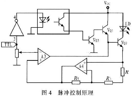 根據(jù)上述設(shè)計思想設(shè)計脈沖控制接口電路,其原理圖如圖4所示。由非門單元,晶體管VQ3,光電耦合器組成。當(dāng)脈沖為高電平時,非門輸出低電壓,使光電耦合器截止,光電耦合器輸出低電平,使晶體管VQ3截止,VQ3集電極輸出高電平使VQ1、VQ2導(dǎo)通,LD正常工作;反之,光電耦合器導(dǎo)通,使VQ3導(dǎo)通,VQ3集電極輸出低電平,使VQl、VQ2截止,LD不工作。在沒有外控脈沖控制信號時,接口懸空,非門輸入高電平,輸出低電壓,光電耦合器不工作,晶體管VQ3截止,VQ3集電極為高電平,使VQ1導(dǎo)通,保證LD的正常連續(xù)發(fā)光。
