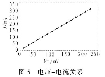 表1是該電路驅(qū)動波長650 nm,功率200 mW的LD連續(xù)工作時,基準(zhǔn)電壓與輸出電流的測試結(jié)果,其電壓-電流關(guān)系如圖5所示。
