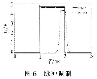 圖6顯示了該驅(qū)動電源輸出的脈沖波形。曲線Input為輸入控制脈沖信號,曲線Output為LD上電壓脈沖。結(jié)果表明:LD上電壓脈沖的上升和下降時間都很短,中間段電壓的穩(wěn)定使輸出電流恒定,恒定的電流幅度保證了LD輸出功率的穩(wěn)定。通過改變輸入脈沖的頻率、脈寬,可得到所需的LD激光脈沖信號。