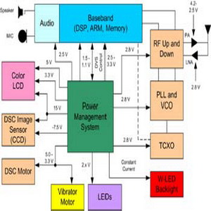 不同的智能型手機零件有著不同的電源需求,(圖二)是行動電話中需要電源的主要零件簡單方塊圖,例如射頻單元的壓控振蕩器(VCO)以及鎖相回路(PLL)就需要極低噪聲和很高電源拒斥比的電源,確保它們提供最高的傳送和接收效能,因此雖然線性穩(wěn)壓器的效率不高,但由于它沒有輸出漣波,所以是這類電源供應(yīng)的最佳選擇;同樣重要的是將直流轉(zhuǎn)換器的開關(guān)頻率,還有它們的二階和三階諧波,都保持在中頻頻帶之外。由于DSP 和中央處理器的核心電壓已降至1V 左右,以電感為基礎(chǔ)的高效率交換式降壓轉(zhuǎn)換器是理想選擇。至于屏幕背光照明所使用的白光二極管,其電源可來自電荷泵浦或電感式升壓/降壓轉(zhuǎn)換器。