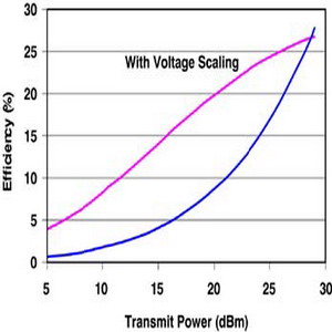 動態(tài)/可適性電壓調(diào)整技術(shù)(DVS/AVS)與高整合度組件所使用的方式很類似,它會把閉回路系統(tǒng)中的處理器和穩(wěn)壓器連結(jié)在一起,并在確保系統(tǒng)正常工作的情形下,將數(shù)字電源供應(yīng)的輸出電壓動態(tài)調(diào)整至最小值。功率放大器會被最佳化,使它在最大傳送功率下?lián)碛凶罡咝?。由于絕大多數(shù)手機都在基地臺附近工作,手機的無線電功能會在維持通訊質(zhì)量的前題下,將傳送功率降至最低水平。當(dāng)功率放大器在較低的功率水平下工作時,它的效率會受到影響,從(圖三)可以看出,利用動態(tài)電壓調(diào)整技術(shù)來調(diào)整功率放大器的電壓,它的工作效率會增加10%至20%。
