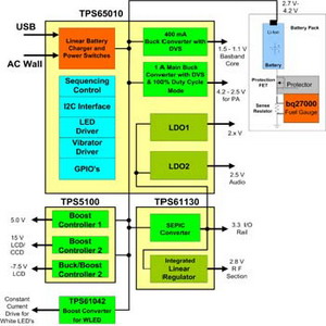 在這個解決方案中,就算鋰離子電池下降至3.3V 左右,在100%負(fù)載周期模式下工作的高效率TPS62200降壓轉(zhuǎn)換器仍能提供3.3V 的I/O電壓。上述所有零件都采用SOT-23 封裝,除了bq24020 電池充電組件、TPS61020 升壓轉(zhuǎn)換器以及TPS61042 白光二極管驅(qū)動組件之外,它們是采用3×3 平方厘米的QFN 封裝。TPS61040 和TPS61042 還內(nèi)建上端FET 晶體管,每顆組件只需要一個外接二極管。bq24020、TPS622xx、TPS61020 和線性穩(wěn)壓器組件全都內(nèi)建FET 晶體管,功率放大器和中央處理器電源采用的動態(tài)電壓調(diào)整技術(shù)可以提高每顆零件的效率,進而協(xié)助降低功耗。