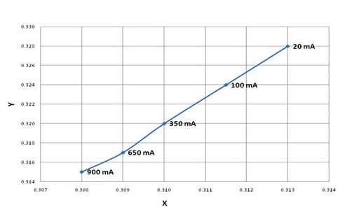 使用減小電流的方法進行LED調(diào)光類似于大多數(shù)白熾燈泡使用的調(diào)光方法。這種減小電流的方法在為數(shù)不多的應(yīng)用中可以接受,但隨著光等級降低,LED發(fā)出的光色彩也根據(jù)電流而變化。電流較小時,色度(Chromaticity)朝向黃色變化。圖1顯示不同電流時的典型色度變化。