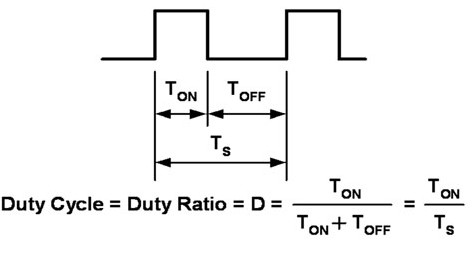 為LED提供脈波電流的方法也稱作PWM,這種方法已經(jīng)成為改變光等級的首選方法。LED本身是矽元件,對應(yīng)流經(jīng)它們的電流導(dǎo)通及關(guān)閉而快速地導(dǎo)通和關(guān)閉。開關(guān)時間在100奈秒(ns)等級,相當(dāng)于最大頻率10MHz。應(yīng)用通常以100Hz~100kHz的頻率工作。頻率低于100Hz時,人眼會觀察到LED光閃爍。頻率在500Hz~20kHz之間時,電路可能產(chǎn)生能聽到的雜訊。調(diào)光是通過在單個開關(guān)周期的某部分時間內(nèi)將LED導(dǎo)通;而在此開關(guān)周期的其余部分時間內(nèi),將LED關(guān)閉來實現(xiàn)。這種導(dǎo)通關(guān)閉周期稱作工作周期(D),其表達方式為LED導(dǎo)通時間(TON)除以整個開關(guān)/導(dǎo)通周期時間(TS)(圖3)。