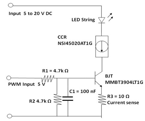 采用簡單的CCR及雙極結(jié)晶體管和PWM訊號控制的LED能夠輕易地調(diào)光至汽車及建筑物照明應(yīng)用要求的精度。使用雙極結(jié)晶體管使LED能夠以恒定電流驅(qū)動,從而不會有色度變化;光的色彩仍然保持一致,僅是LED發(fā)射的光量減小。