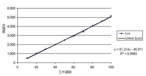 控制訊號的工作頻率為300Hz,脈波寬度為30微秒(μs)。隨著脈波寬度增加,LED導(dǎo)通的總時間也會延長,并提升光輸出。在脈波接近零電平時,光輸出也將接近零。圖5顯示不同工作周期條件下的流明輸出曲線。