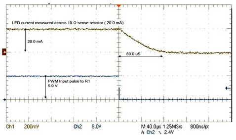 在LED導(dǎo)通期間,流經(jīng)LED的電流保持恒定,使LED發(fā)射的光恒定,且無色度(色彩)變化。亮度與LED導(dǎo)通時間所占的百分比成正比。