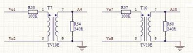 此系統(tǒng)輸出電流小于1A,故選擇最大可以測(cè)量1A的電壓型電流互感器TA1410,負(fù)載電阻用是200歐,輸出電壓為-1V~1V的交流電壓。電路如圖4所示。