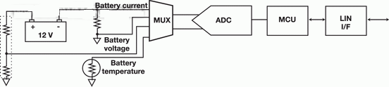 (3) 通信接口:目前,本地互連網絡 (LIN) 接口是電池傳感器和ECU之間最常用的通信接口。LIN是廣為人知的CAN 協(xié)議的單線、低成本替代方案。