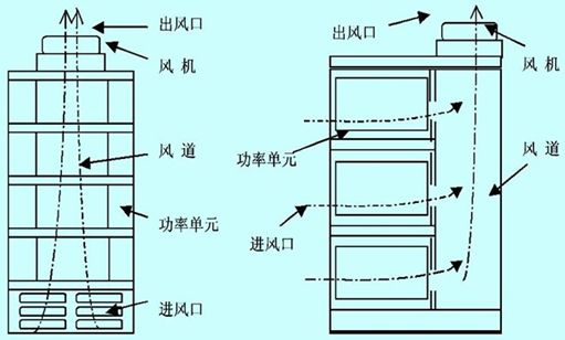 高壓變頻器常風的冷卻方式主要為散熱器強制風冷、循環(huán)水冷卻和熱管冷卻等。因強制風冷方式簡單,不存在水冷時的凝露問題,以及熱管散熱器設計的復雜性,在確定合適的通風結(jié)構的情況下,一般采用此種方式。采用強制風冷方式需要在結(jié)構設計時考慮散熱風道。散熱風道的設計應在充分考慮單元散熱的要求下,應盡量優(yōu)化。常見的多電平串聯(lián)方式的高壓變頻器,從結(jié)構上分為功率柜體、變壓器柜、控制柜。功率柜風道設計通常有兩種方式:串聯(lián)風道和并聯(lián)風道。