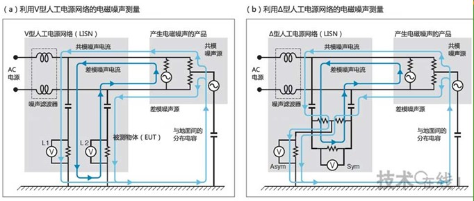 在傳導(dǎo)噪聲的測(cè)量中,一般針對(duì)電源線1(L1)和電源線2(L2)各自的電磁噪聲,利用V型人工電源網(wǎng)絡(luò)測(cè)量準(zhǔn)峰值和平均值(a)。在該測(cè)量中,差模噪聲和共模噪聲合在一起,難以分辨哪種噪聲模式是主體。而如果利用Δ型人工電源網(wǎng)絡(luò),便于分辨噪聲模式的種類(b)。該電源網(wǎng)絡(luò)可根據(jù)噪聲模式(Sym:差模,ASym:共模)測(cè)量其頻率特性。
