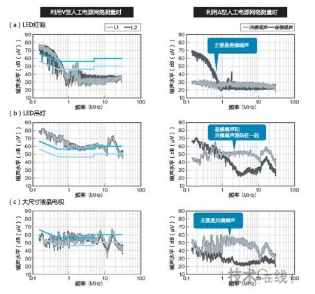 電子產(chǎn)品的種類變了,噪聲成分的構(gòu)成也會(huì)變化。例如,LED燈泡主要是差模噪聲,LED吊燈中差模噪聲和共模噪聲混在一起(a,b)。而大尺寸液晶電視主要是共模噪聲(c)。