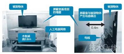 傳導(dǎo)噪聲的測(cè)量在屏蔽室內(nèi)進(jìn)行。測(cè)量條件由“CISPR16-2”或“ANSI63-4”等標(biāo)準(zhǔn)規(guī)定。兩種標(biāo)準(zhǔn)中規(guī)定,屏蔽室的基準(zhǔn)面與被測(cè)物體的距離要保持在0.4m,連接人工電源網(wǎng)絡(luò)和被測(cè)物體的電線長度為0.8m,被測(cè)物體設(shè)置在高0.8m的臺(tái)子上(圖5)。