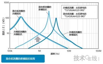 混合扼流圈不但具備與相同尺寸的共模扼流圈相同程度的共模阻抗,還具有更高的差模阻抗。