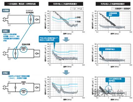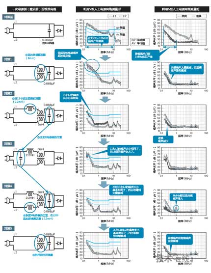 為了修正這種不均衡,我們③試著改變了X電容的位置。這樣一來,L1的噪聲增大了,L1和L2的噪聲大小變得基本一樣。但這并不能解決問題。因此,作為消除不均衡的其他方法,我們④恢復(fù)了X電容的位置,在L2中追加了差模扼流圈(2.2mH)。也就是說,在L1和L2中分別安裝了差模扼流圈。這次,不但L1和L2的噪聲大小基本相同了,而且全部大幅衰減。不過又出現(xiàn)了一個(gè)新問題,那就是1MHz附近的共模噪聲增加了。